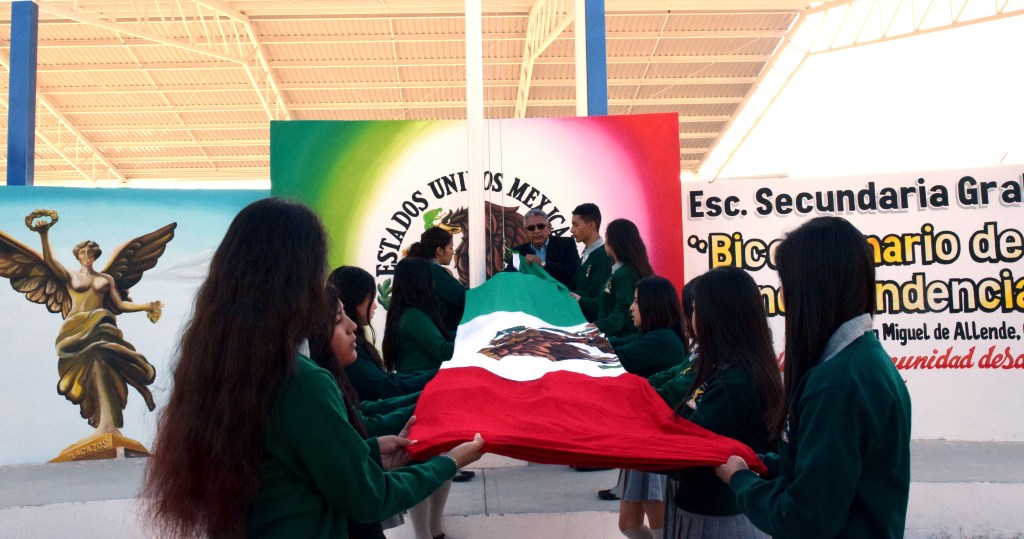 San Miguel de Allende, Gto.- En solemne acto cívico, alumnos y personal docente de la secundaria “Bicentenario de la Independencia” conmemoraron el 212 aniversario del nacimiento de Benito Juárez; además de izar la nueva bandera que recibieran por parte de la dirección de Educación e Infraestructura.