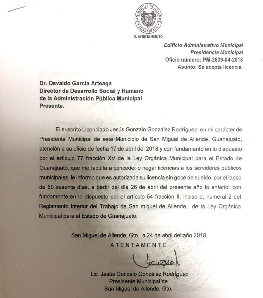 San Miguel de Allende, Gto. – Con el propósito de garantizar la equidad de la contienda y transparentar el desempeño de la administración pública según marcan los lineamientos de la Constitución Política de los Estados Unidos Mexicanos y del Instituto Nacional Electoral, personal directivo, de subdirección y administrativo, solicitan licencia a su cargo con vigencia a partir de este jueves 26 de abril del 2018.