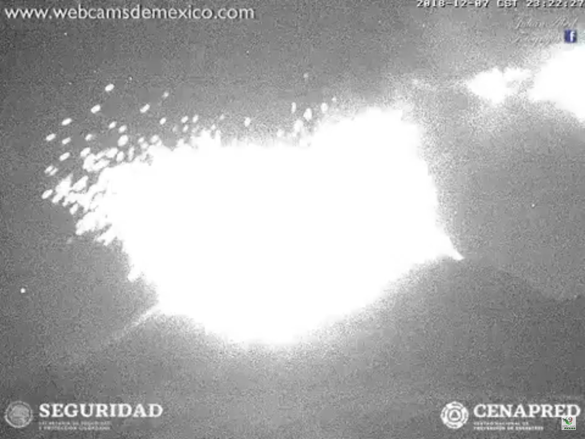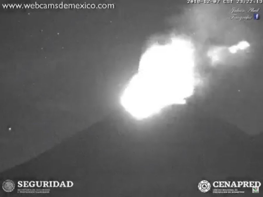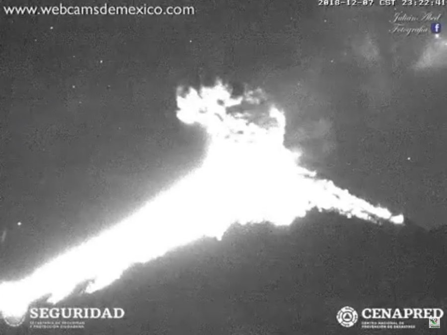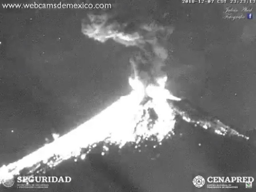 La noche de este viernes 7 de diciembre el volcán Popocatépetl entró en erupción dos veces, emitiendo espectaculares destellos de luz, seguidos de deslumbrante material incandescente que se derramó fuera del cráter y bajó la ladera de la montaña.