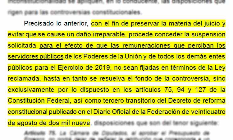 El ministro Alberto Pérez Dayán admitió a trámite la acción de inconstitucionalidad interpuesta por 55 senadores de oposición y concedió la suspensión de la aplicación de la Ley Federal de Remuneraciones de los Servidores Públicos hasta que el pleno del alto tribunal resuelva el fondo del asunto.