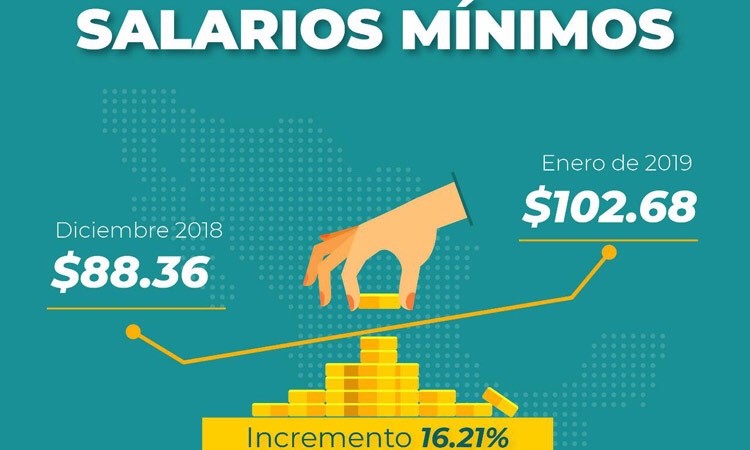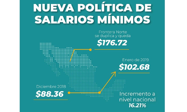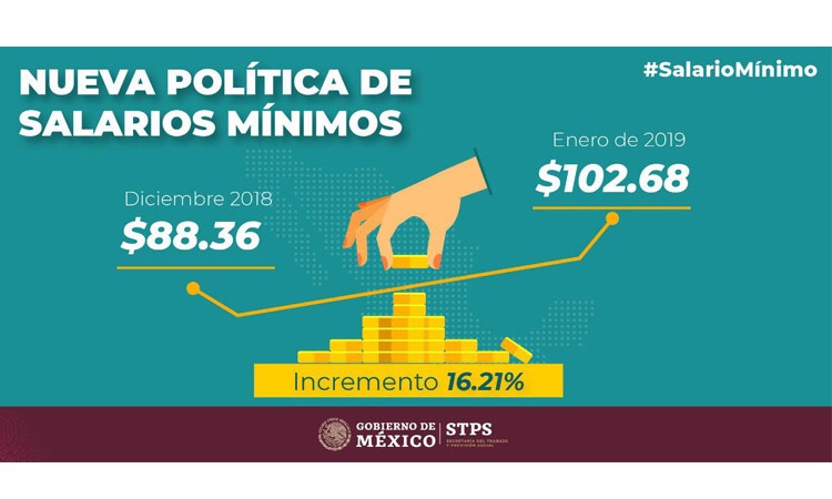 La Confederación Patronal de la República Mexicana (Coparmex) informó este lunes a través de su cuenta de Twitter, que por acuerdo tripartita y unánime, el salario mínimo pasará de 88.36 a 102.68 pesos diarios a partir de enero 2019.