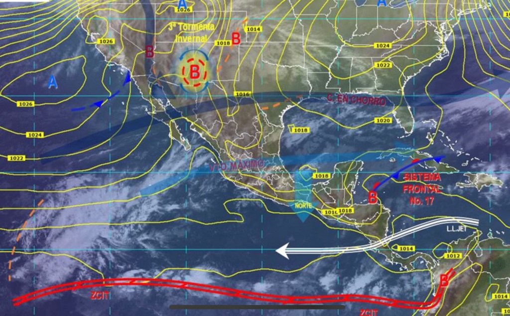 La Conagua informa que se prevé la formación de la tercera tormenta invernal en la frontera norte, que provocará lluvias y ambiente muy frío en el noroeste y norte de México.