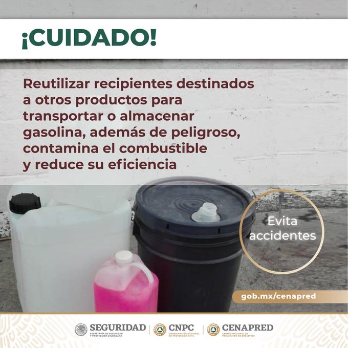 En su cuenta de Twitter, destacó que reutilizar recipientes destinados para otros productos, como lo son garrafones para agua, es sumamente peligroso, por lo que sugirió a los ciudadanos evitar accidentes.