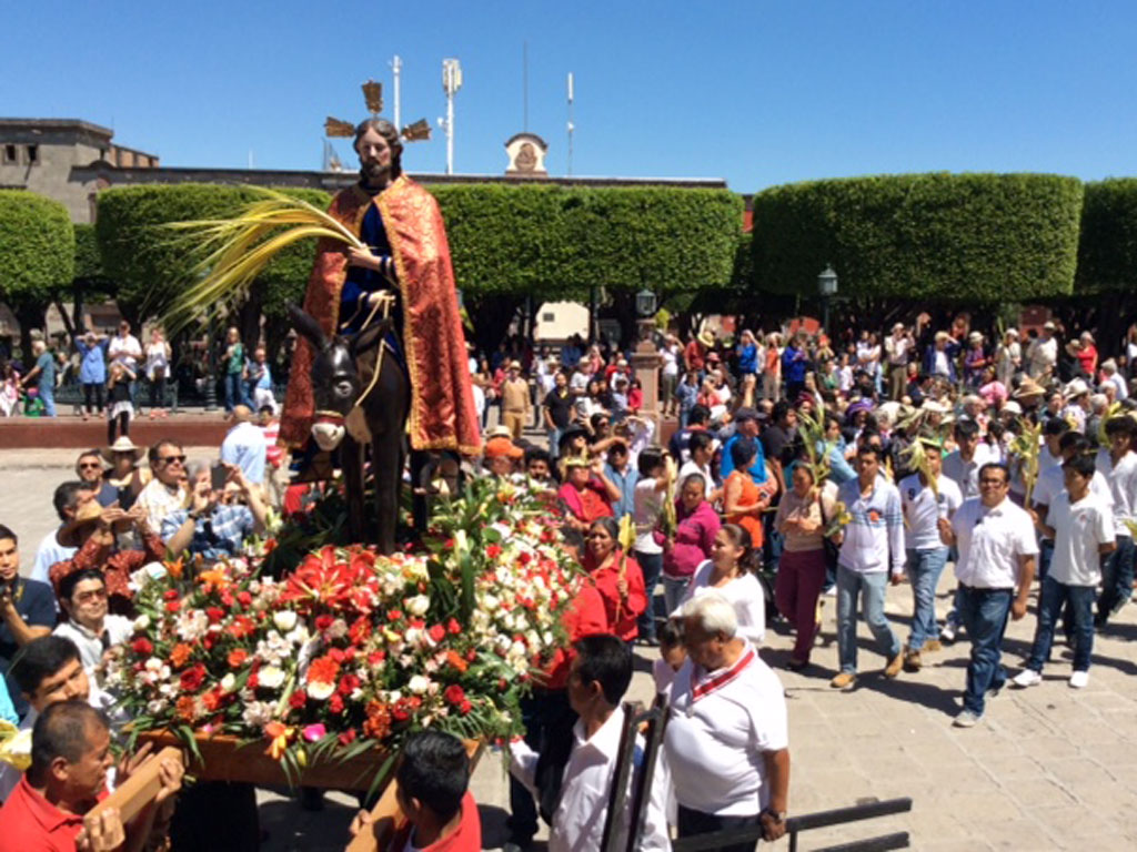El domingo de ramos en San Miguel de Allende los fieles al catolicismo acostumbran comprar palmas tejidas afuera de las iglesias, que son bendecidas por las autoridades eclesiales. A las 6:30 de la tarde saldrá del templo “Nuestra Señora de la Salud” la procesión de ramos con la imagen del “Señor del Triunfo”, atraviesa la Antigua Plaza de Armas, continúa por “Mesones” y “Pepe Llanos”, y concluye en el templo del “Oratorio”.