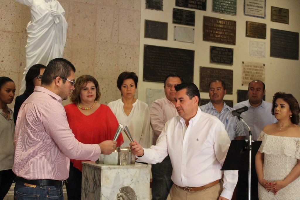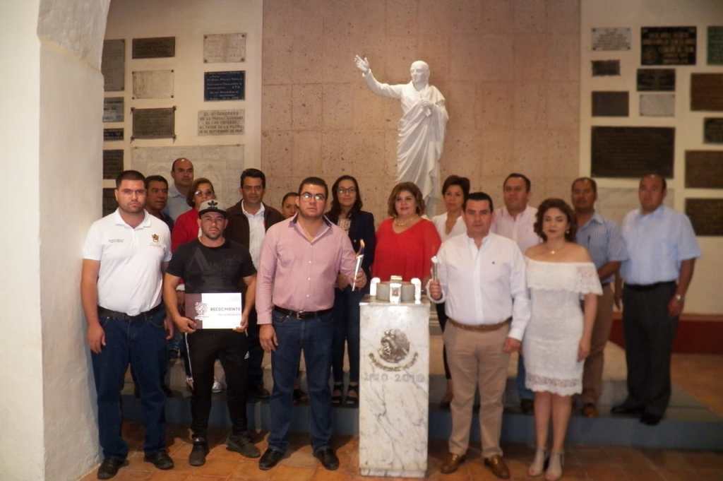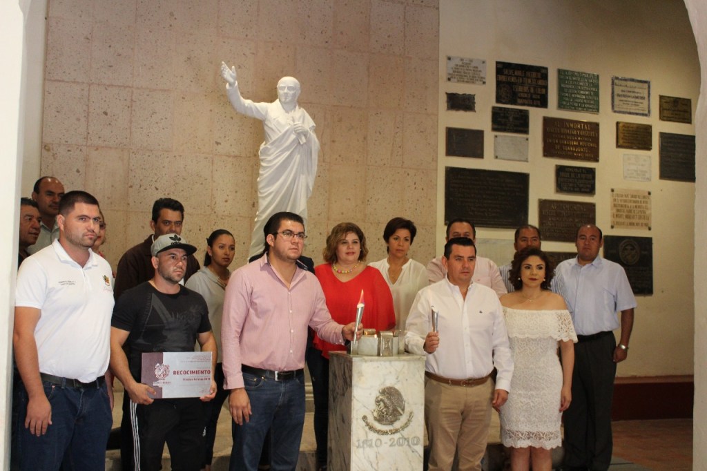 El Presidente Municipal Miguel Ángel Rayas Ortiz, acompañado de los integrantes del Honorable Ayuntamiento 2018-2021, entregaron el fuego simbólico directamente de la sala cívica del museo Casa de Hidalgo, al asesor jurídico del Municipio de Coalcomán, Michoacán, Lic. Miguel Ángel López García, representante personal del Presidente Municipal de Coalcomán Velázquez Michoacán.