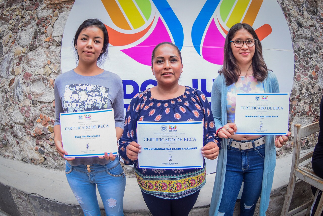 Le entrega de estas constancias de becas se dio en el patio principal del Palacio Municipal y acudieron alumnos de las siguientes escuelas: Grupo Educativo IMEI, Centro de Estudios Superiores Allende (CEESA), Universidad Allende y el Instituto Sanmiguelense.