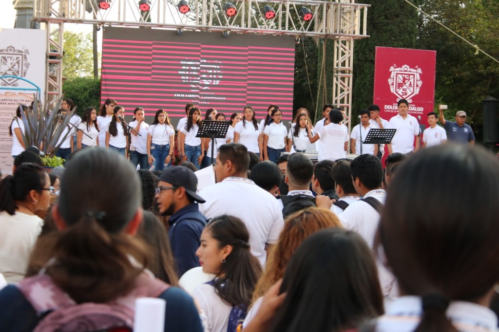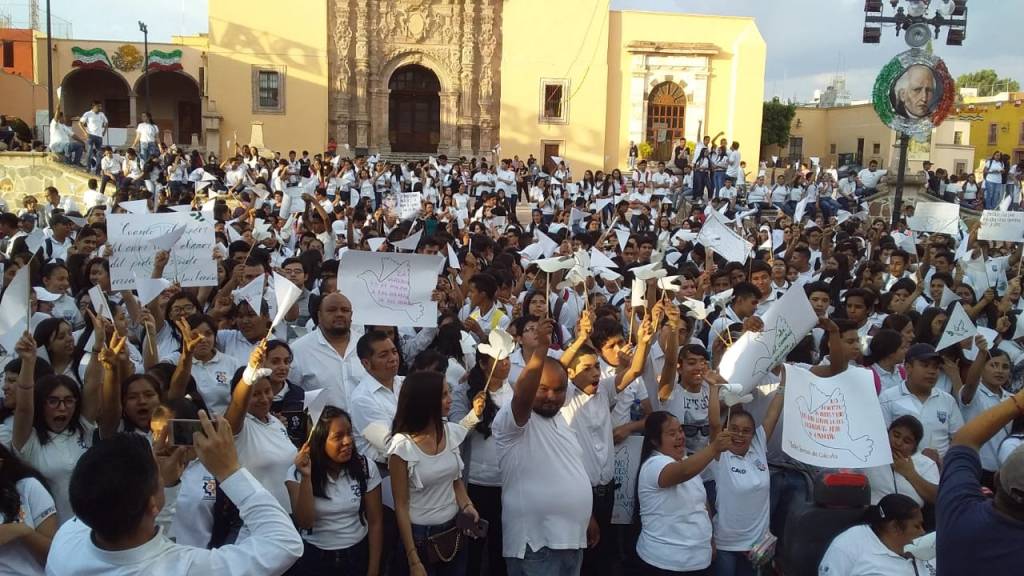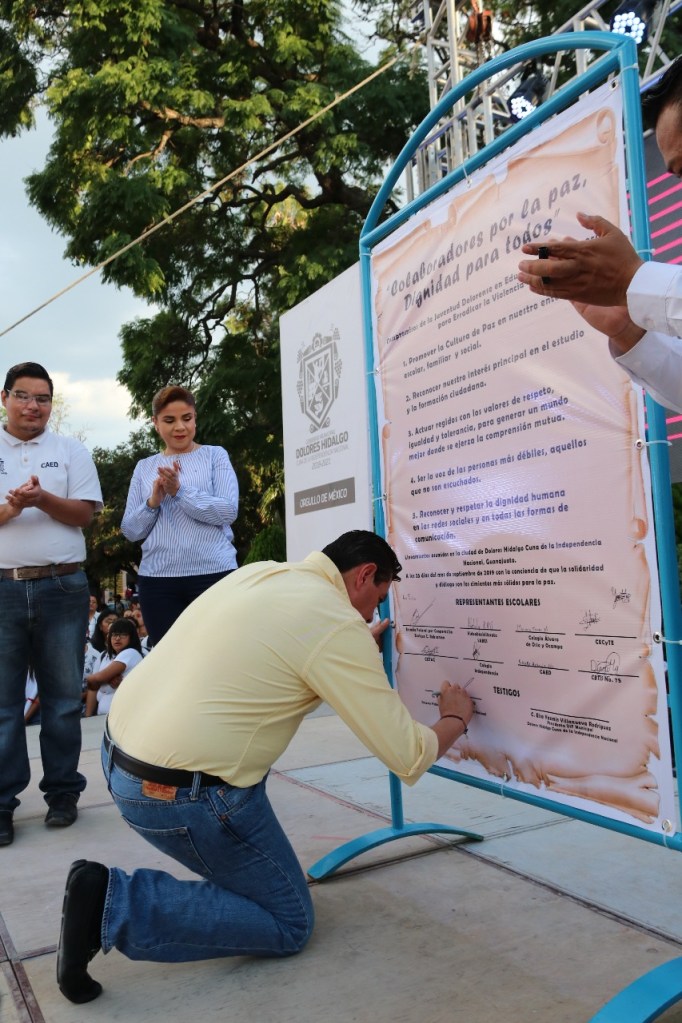 DOLORES HIDALGO CUNA DE LA INDEPENDENCIA NACIONAL, GTO.- Promoviendo la cultura de la paz y la convivencia pacífica, cerca de 3 mil jóvenes de nivel medio superior y superior participaron en una marcha silenciosa que llegó al Centro Histórico donde realizaron la firma de un Acuerdo por la Paz y varias actividades artísticas.