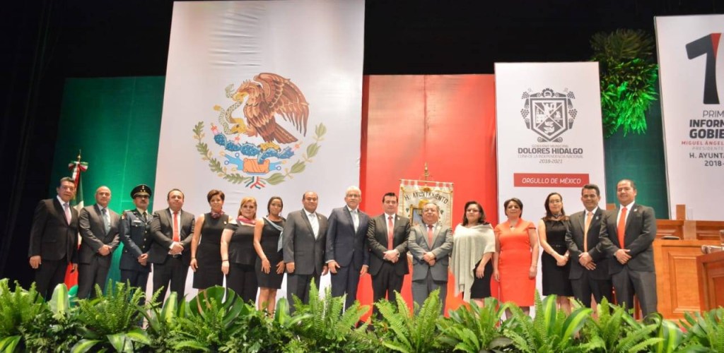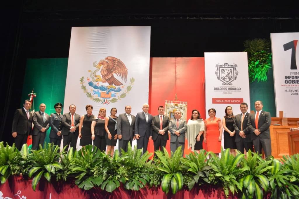 DOLORES HIDALGO CUNA DE LA INDEPENDENCIA NACIONAL, GTO.- El Presidente Miguel Ángel Rayas Ortiz e integrantes del Honorable el Ayuntamiento Municipal 2018-2021, en sesión solemne, presentaron su Primer Informe de Gobierno, teniendo como representante del Gobernador del Estado, al Secretario de Gobierno del Estado Lic. Luis Ernesto Ayala Torres, el Diputado José Huerta Aboytes en representación del Congreso del Estado y la representante del poder judicial Lic. Luz Nuño Aviña.
