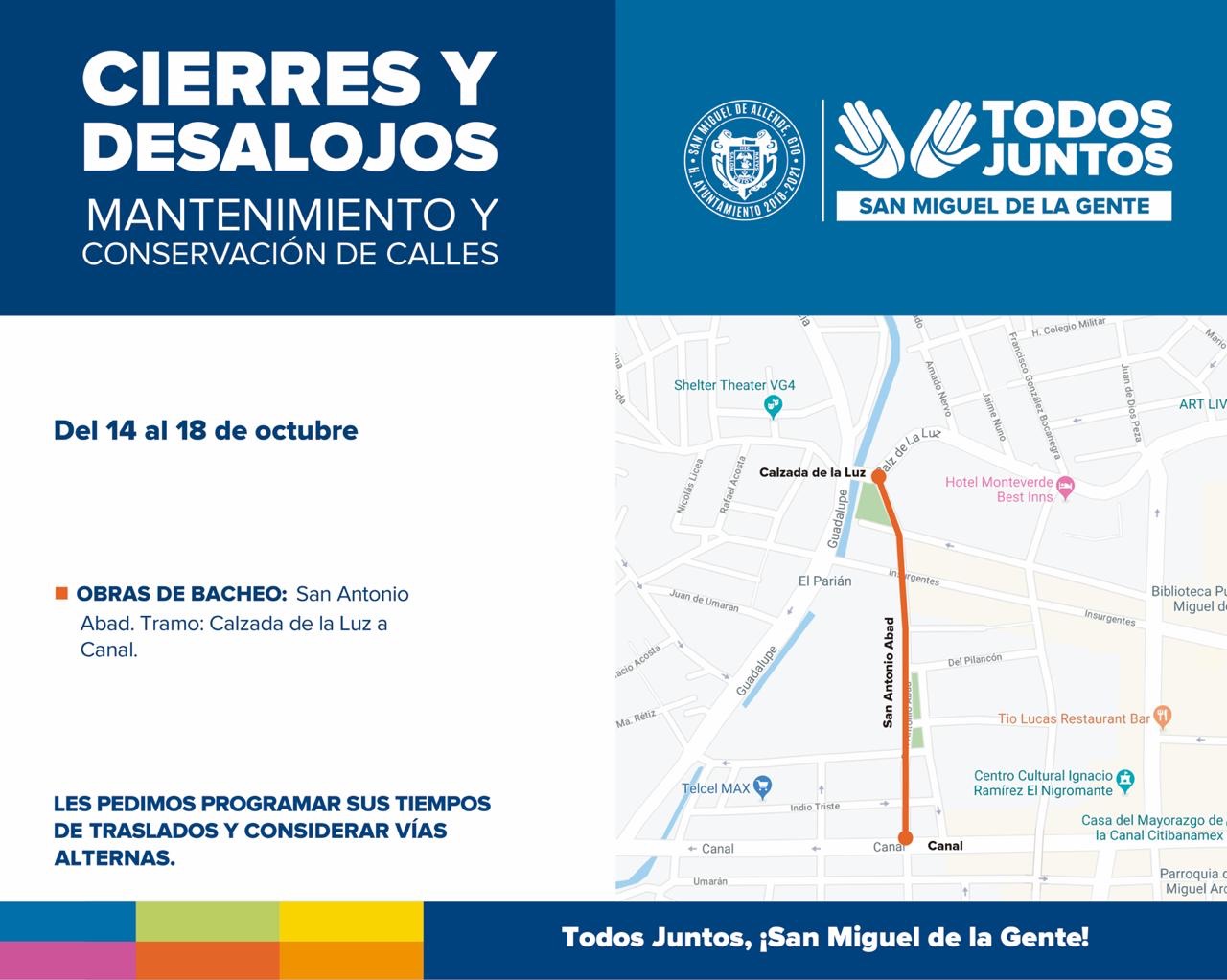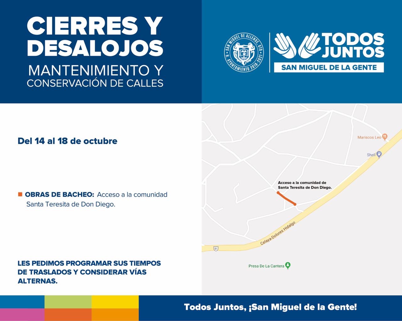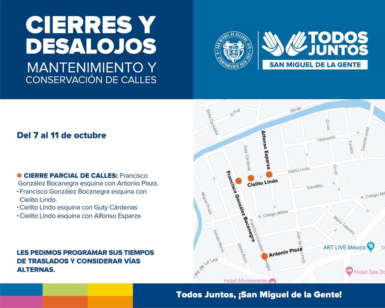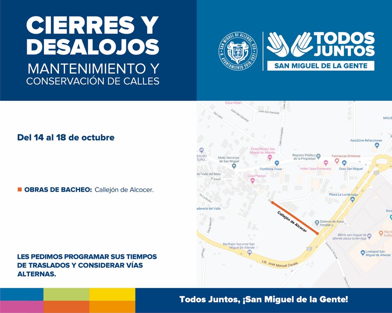 San Miguel de Allende, Gto., a 15 de octubre de 2019.- La Dirección de Infraestructura y Obras Públicas continúa con trabajos de bacheo en algunas zonas del municipio, por lo cual se realizarán cierres parciales de calles.