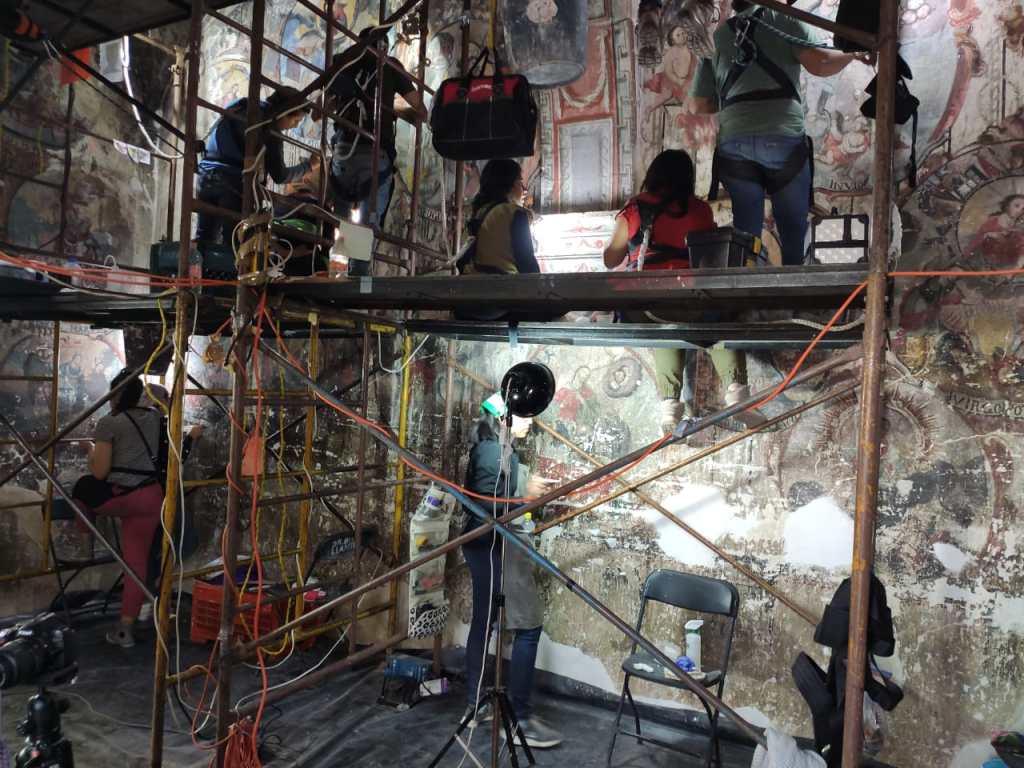 DOLORES HIDALGO CUNA DE LA INDEPENDENCIA NACIONAL, GTO.- Jóvenes estudiantes de la Escuela Nacional de Conservación, Restauración y Museografía del Instituto Nacional de Antropología e Historia, durante tres semanas realizaron trabajos de recuperación de las pinturas en la capilla de la Letanía del Templo Señor de los Afligidos en la localidad del Llanito.