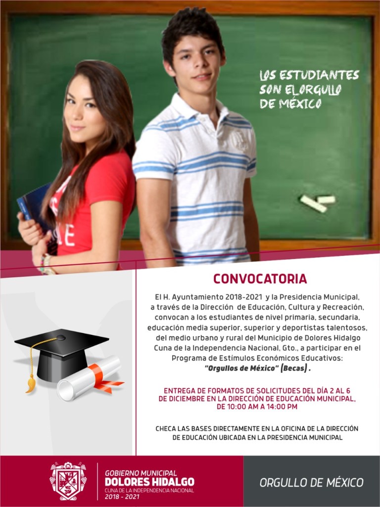DOLORES HIDALGO CUNA DE LA INDEPENDENCIA NACIONAL, GTO.- Promoviendo la educación y el desarrollo de los estudiantes de la Cuna de la Independencia Nacional, la Administración Municipal 2018-2021, a través de la dirección de Educación, Cultura y Recreación, invita a los estudiantes de nivel básico a participar en el Programa de Estímulos Económicos Educativos; “Orgullo de México”.