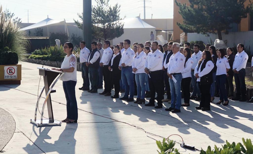 En punto de las 9 de la mañana, los miembros de las diferentes Secretarías y Direcciones se reunieron en la explanada del Edificio Administrativo para llevar a cabo el acto cívico, como cada primer lunes de mes, según estipuló el Ayuntamiento en acuerdo público.