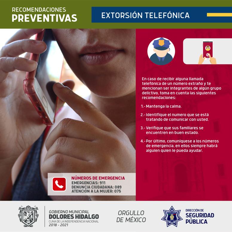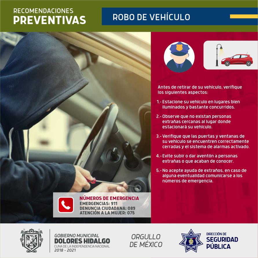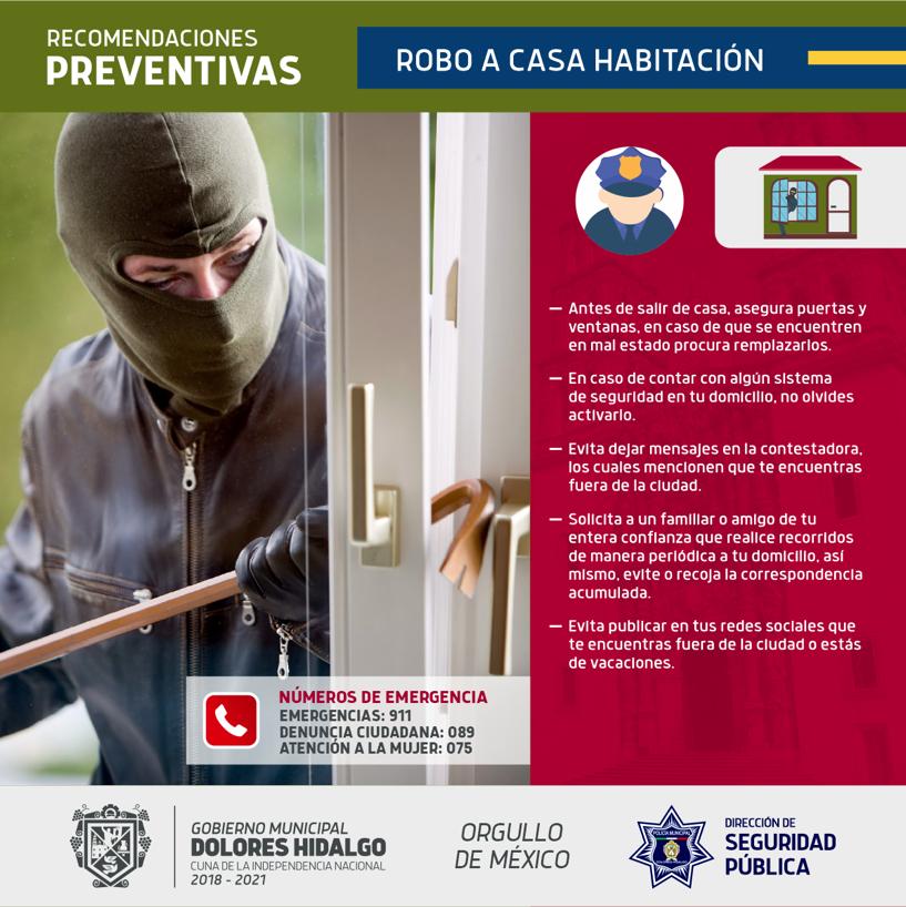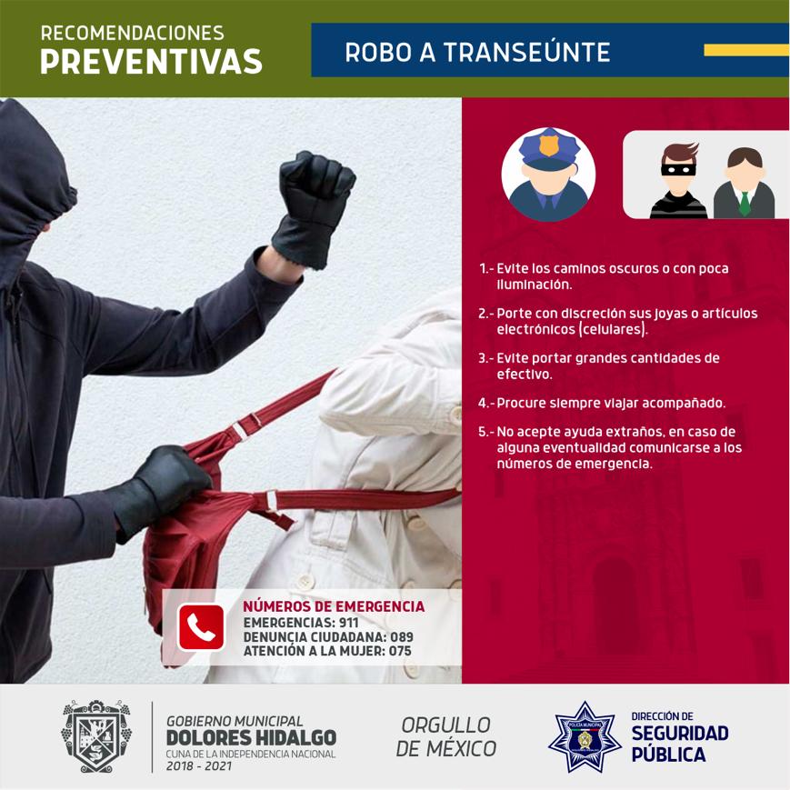 DOLORES HIDALGO CUNA DE LA INDEPENDENCIA NACIONAL, GTO.- Promoviendo la cultura de la prevención y la denuncia ciudadana, la Administración Municipal 2018-2021 a través de la dirección de Seguridad Pública invita a la ciudadanía en general a adoptar medidas de prevención para evitar ser víctima de robos, delitos o actos que violenten el patrimonio y bienestar de familias dolorenses y visitantes.