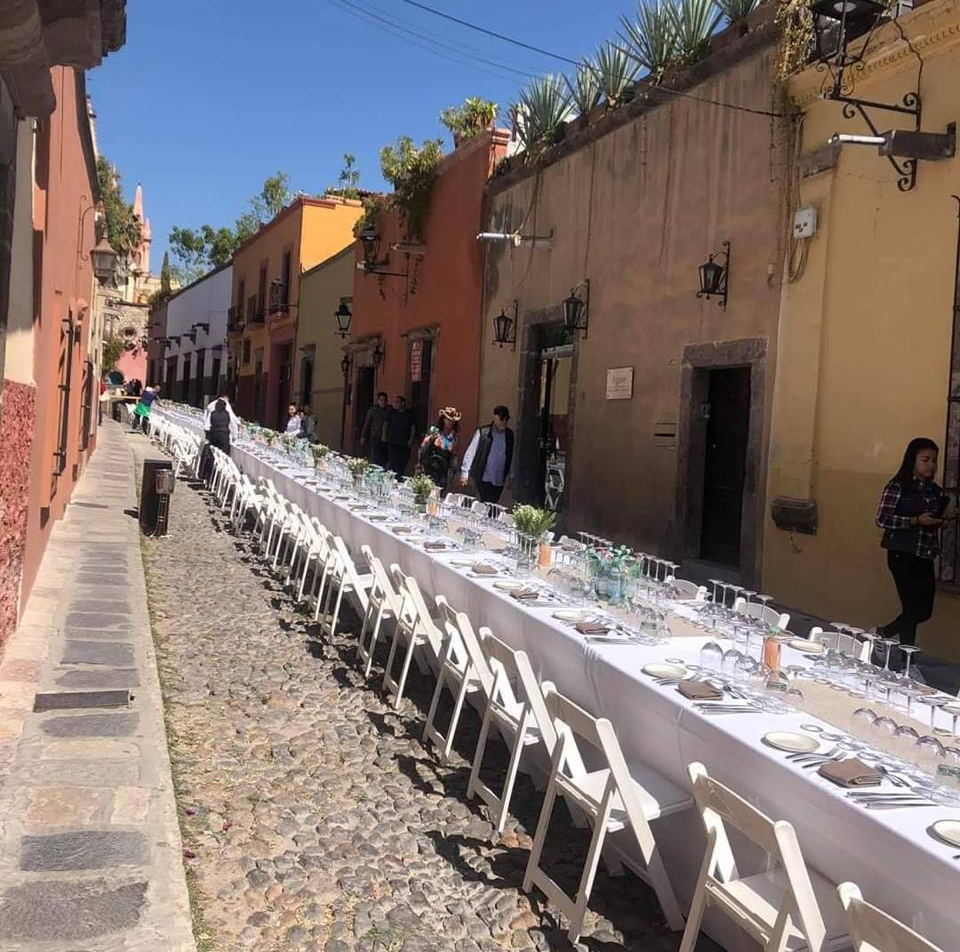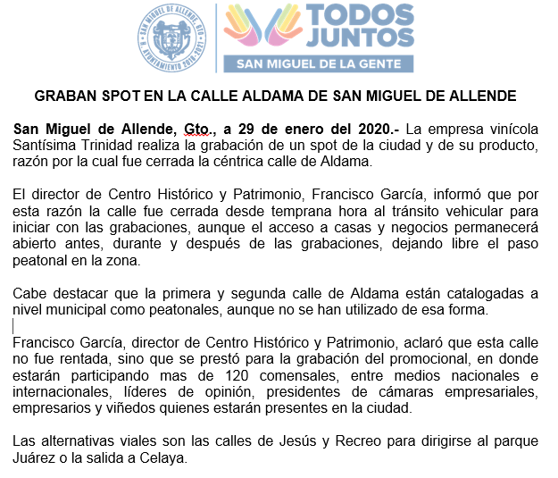 sin embargo, el gobierno municipal a través de la dirección de Patrimonio Cultural dio a conocer que el montaje de una mesa larga sobre toda la calle de Aldama servirá para la grabación de un video clip de un viñedo denominado Santisima Trinidad donde se atenderán a 120 comensales.