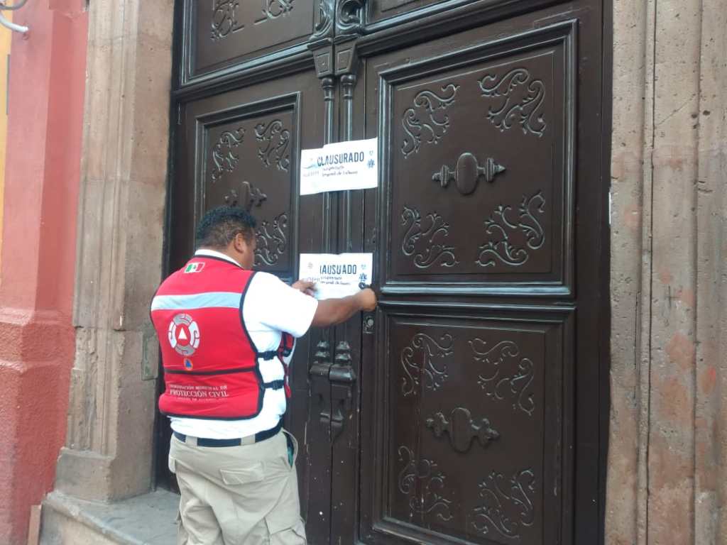 A las 4 de la tarde comenzaron el cierre de espacios y plazas públicas de todo San Miguel de Allende. Elementos de la dirección de Protección Civil, adscritos a la Secretaría de Seguridad Pública colocaron vallas y cinta delimitante en todos los accesos a los puntos de concurrencia como Antigüa Plaza de Armas, Jardín Principal, Plaza San Francisco, Insurgentes, etc.